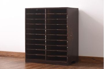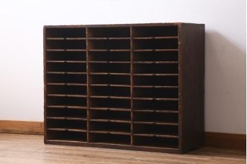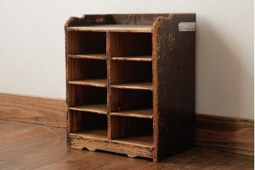 アンティークシェルフ棚がマス目に区切られた収納力もあるシェルフ