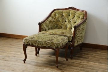 今回使ったアンティークソファは、フレームがナラ材製で高級感のあるしっかりとした作り。座面は当店で張り替え済みで、背もたれにはシャビーな花柄の鋲飾りが付いています。シックで美しいデザインで、リラックスタイムも贅沢な気分を味わえそうですね。