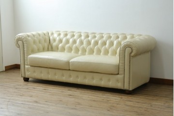 チェスターフィールド総本革張りの伝統的なレザーソファ。ボタン留めや鋲飾りなどクラシカルで堅牢な意匠が特徴
