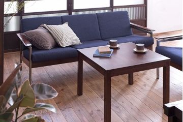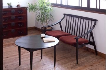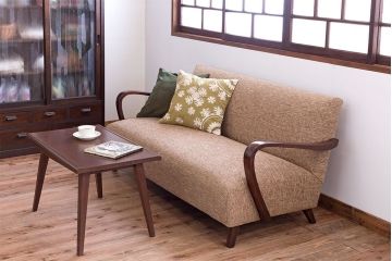 こちらは、和製アンティークソファを使ったレトロなコーディネート例。全体的に古い木味が素敵なアンティーク家具を取り入れて、温かでほっと落ち着くようなリビングを作りました。