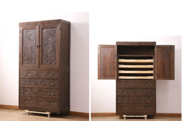 満開に咲き誇る桜の装飾が見事なキャビネットです。全体を覆うように散りばめられた桜の彫りに、ついうっとりと見入ってしまいそうです。