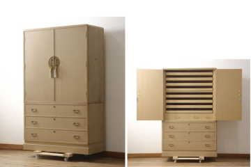 桐箪笥(桐たんす)の中でもおそらく最もポピュラーなのが、このタイプ。上部に衣装盆、下部に引き出しという衣類収納に特化した作りで、着物はもちろん洋服などもしまっておけます。衣装盆はパッと見深さがあまりないように思えますが、通常は着物2・3枚程度なら問題なく収納できるだけの深さがあるので、衣装持ちの方でも安心。和装をよくされる方にはピッタリの桐箪笥です。