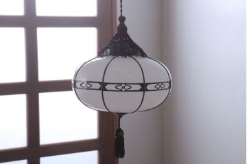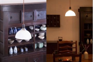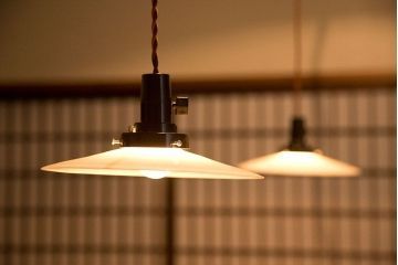 和風や和モダンテイストのインテリアには、やはり日本の伝統的なアンティーク照明がぴったり。ガラスシェードのものだと、平笠シェードのシンプル・レトロな照明や、切子ガラスやぼんぼり型ガラスの和風照明などがあります。特にシンプルな平笠シェードのペンダントライトは、古民家インテリアや和モダンインテリアに人気。小ぶりなサイズなので、複数灯並べて使うのがおすすめですよ。切子ガラスやぼんぼり型の照明は、純和風のインテリアに特に人気です。