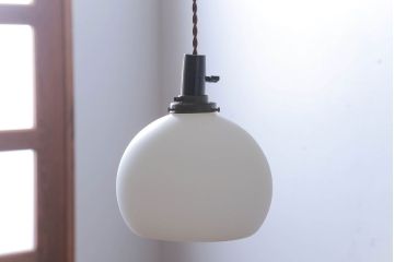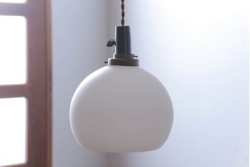 シンプル・ナチュラルなインテリアには、空間に溶け込むようなシンプルなシェードのアンティーク照明がおすすめ。例えば、和製アンティークのガラスシェード照明や球体型のガラス照明、北欧アンティークの木製照明などがぴったりです。存在感は控えめですが、アンティークらしい味わいがあって部屋に味わい深い雰囲気をプラスしてくれます。また、ちょっと個性をプラスしたい方には、オパールガラスシェードやホーローシェードなど、ユニークな素材感のアンティーク照明を取り入れるのもおすすめですよ。