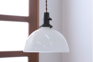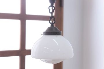 シンプル・ナチュラルなインテリアには、空間に溶け込むようなシンプルなシェードのアンティーク照明がおすすめ。例えば、和製アンティークのガラスシェード照明や球体型のガラス照明、北欧アンティークの木製照明などがぴったりです。存在感は控えめですが、アンティークらしい味わいがあって部屋に味わい深い雰囲気をプラスしてくれます。また、ちょっと個性をプラスしたい方には、オパールガラスシェードやホーローシェードなど、ユニークな素材感のアンティーク照明を取り入れるのもおすすめですよ。