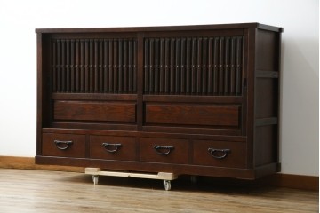 新規製作こちらは、当店で販売していた商品を参考に新規製作したオーダー水屋です。引き出しの取っ手、引き戸の意匠など細部までとことんこだわり、まるで時代箪笥のような立派なオーラ漂う水屋に仕上がりました。