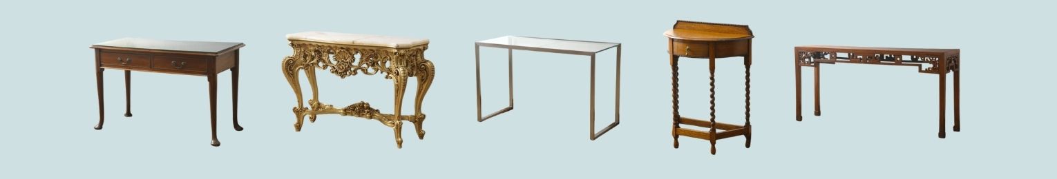 当店では、イギリスやフランスなどの西洋デザインを中心に、様々なコンソールテーブルを販売中です。クラシカルなアンティークやヴィンテージのコンソールテーブルだけでなく、スタイリッシュな高級ブランドのものまで幅広く取り揃えております。