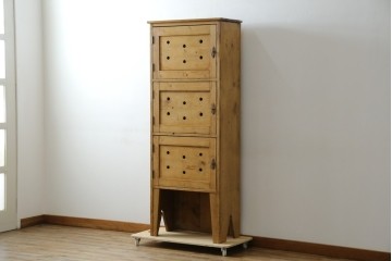 こちらの部屋は、ライトグリーンのアンティーク食器棚がアクセント。ヴィンテージ感たっぷりの個性的なカラーがステキですよね。引き出しと引き戸がたっぷりと付いた作りで、収納力や使い勝手も文句なしです。
