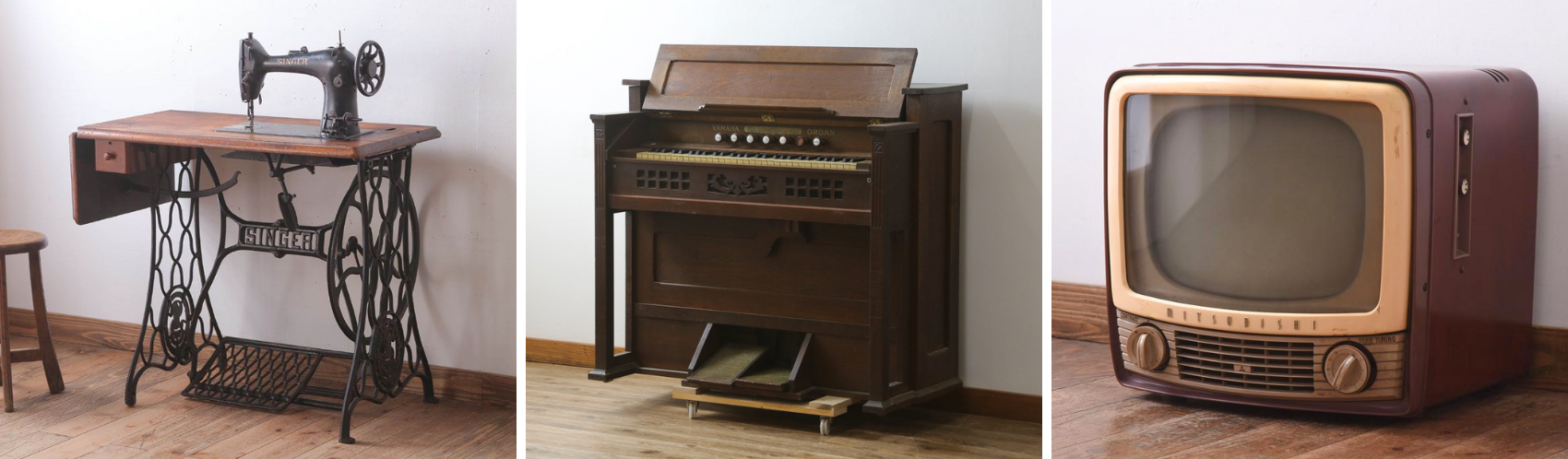 例えばアンティークの足踏み式ミシンや楽器、家電、レジスターなどがこれに該当します。
