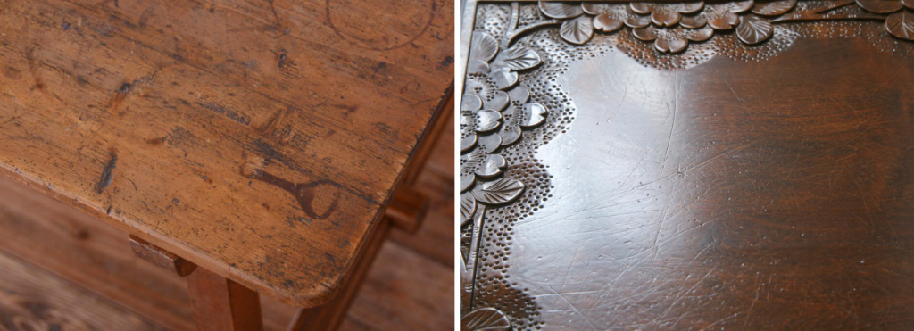 ラフジュ工房では、アンティークやヴィンテージなど年代を経た家具特有の傷やシミについては、ご使用に問題のない限りそれもまた「味わい」の一つと考えています。