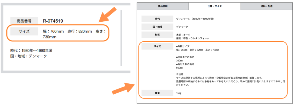 ラフジュ工房では、商品のサイズについてこのように複数箇所に記載しています。