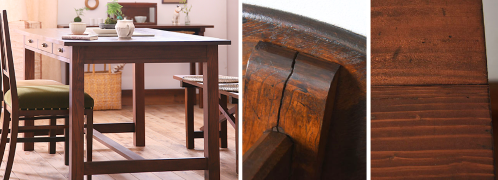 アンティーク家具に限らず、無垢材を使用した家具は気温や湿度の変化によって収縮する性質があります。