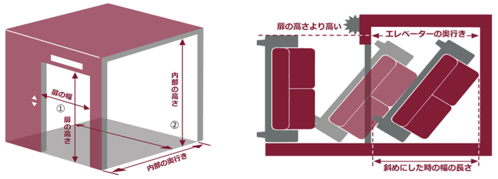 この場合はエレベーター内の奥行きに家具が収まるかどうか、家具の大きさに切った段ボール等で念のため確認しておくと安心です。