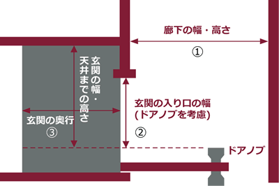 また、入口前の有効幅が狭く天井も低い場合は、扉が邪魔して通れない・向きを変えることができない恐れがあります。