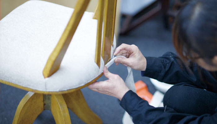 チェアやソファは座面のへたり具合含め、まず全体の状態を確認します。状態が良ければ基本オリジナルのまま残し、必要があれば内部のクッションなどまとめて交換します。