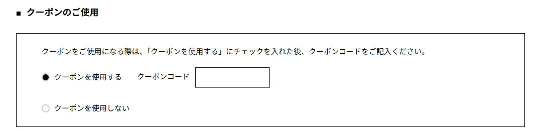 ご注文手続き画面へお進みいただくと、クーポンの使用・不使用を選択できるようになっております。