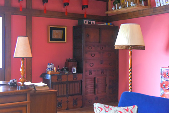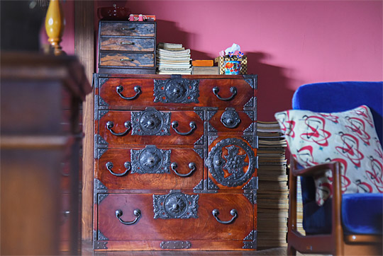大胆ながらもまとまりのあるコーディネートの中で、ラフジュ工房が提供した和の風情を漂わせる時代箪笥の数々も独特の味わいを加えています。