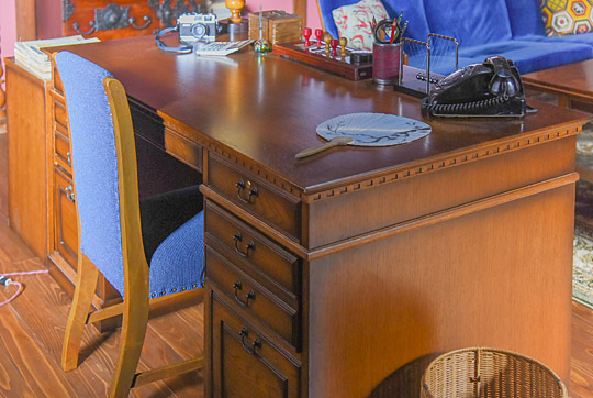 主人公が座るデスクチェアの鮮やかなブルーのファブリックが、赤系のインテリアが多い空間の中でいいアクセントになっていますね。