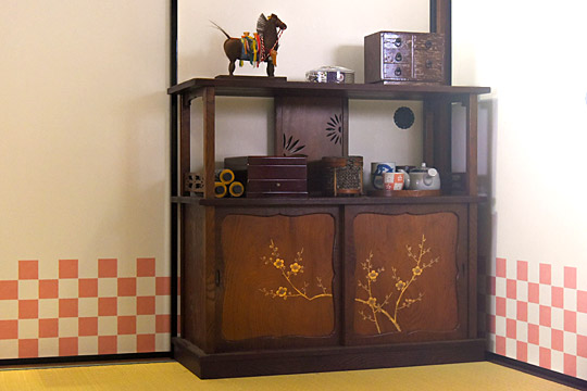 金の蒔絵が施された茶棚には湯呑みや急須などがしまわれており、ここで暮らす人々の日常の気配をさりげなく演出しています。