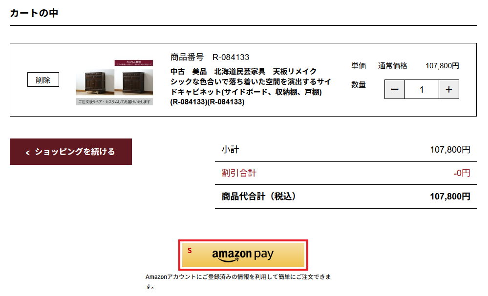 カートの中に入るとすぐ「amazon pay」のボタンがありますので、そちらをクリックしてください。