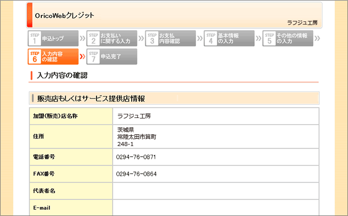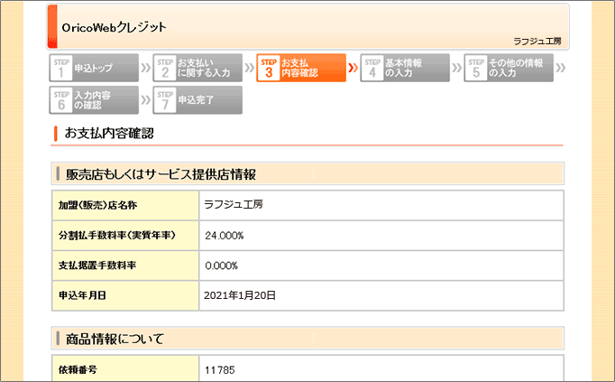 お買い物終了後、『オリコWEBクレジットショッピングローン審査申込画面』へ進みます。