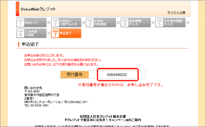 お申し込みが無事完了すると「受付番号」が表示されます。