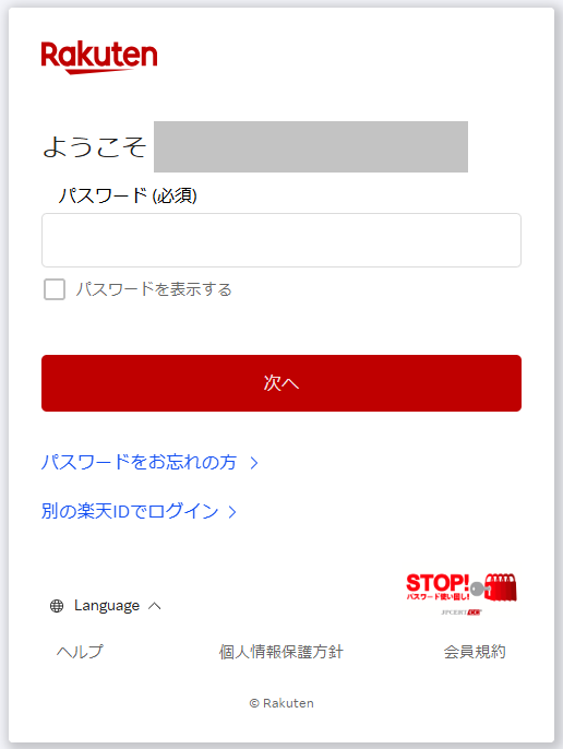 ボタンをクリックすると楽天IDのログイン画面が表示されます。