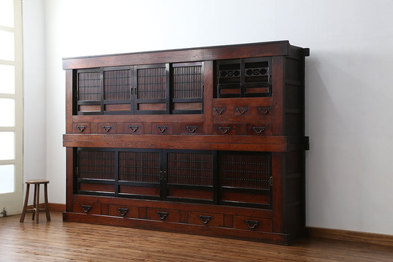 ↑ 古色蒼然たる前面欅材の二段重ね九尺水屋箪笥(幅:2675mm)