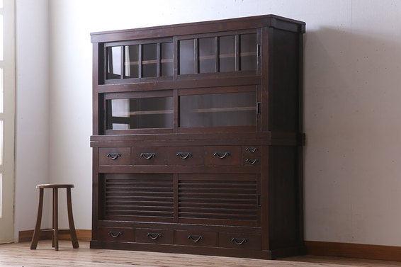 ↑ 岐阜産 ガラス仕上げ引き戸!二段重ねアンティーク五尺水屋箪笥(幅:1470mm)