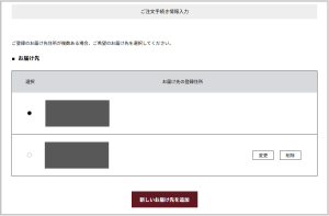 予めマイページにて、複数のお届け先をご登録いただいている場合は、ご注文手続き画面でこのように表示されます。