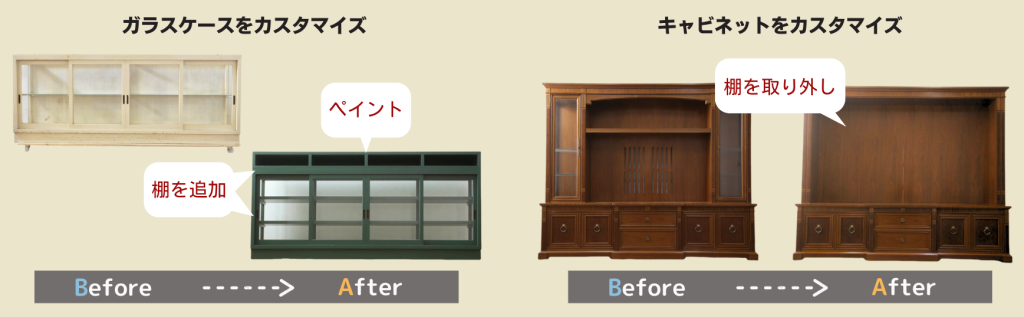 脚や取っ手を付けたり、色・サイズを変えたり、ガラスを交換したり…できることは無限大。