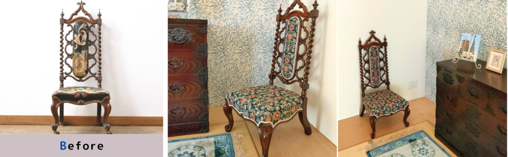 高品質リペア込みでしたが、指定の張り地の中には好みの生地がなく、自分で探して購入したゴブラン織り生地を送り張り替えていただきました。
