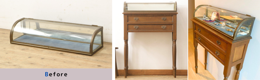 上部のガラスケースは100年前のフランス製アンティークをそのまま使用し、とにかくアンティークの雰囲気を大切にしながら、下部のテーブルと引き出しを完全造作してくださいました。