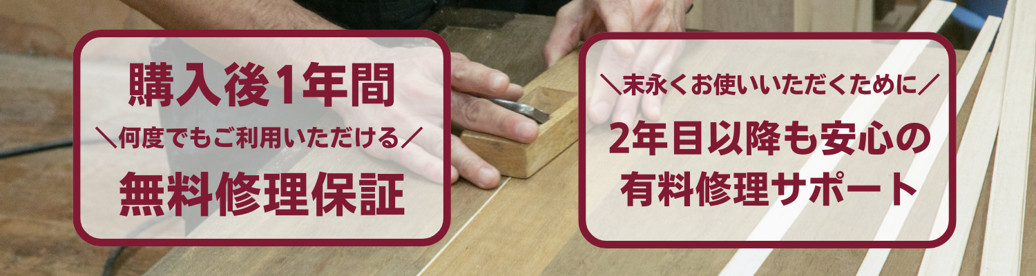 当店では木製家具の性質上、自然と起こり得る不具合について、購入後1年間であれば何度でも無料で修理いたします。