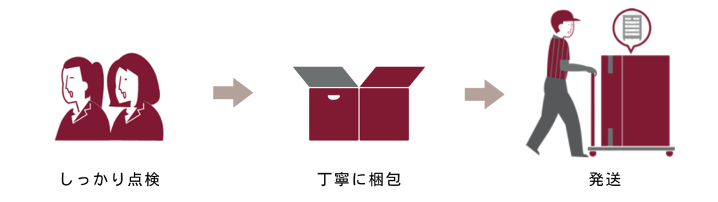 発送時には最終チェックとして、扉の開け閉めや脚のガタつきなど使いにくい部分がないか?届いたその日から使えるようきれいに清掃されているか?などを確認の上、配送中に破損がないよう丁寧に梱包して送り出します。
