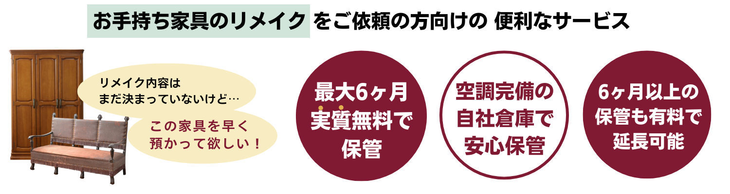 なお、保管期間はお品物の当店到着日を含み6ヶ月を想定しておりますが、リメイク・修理の内容を決めるのに時間がかかり、万が一6ヶ月を超過してしまう場合には、さらに6ヶ月の保管延長が可能です。