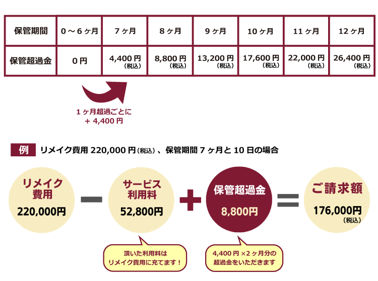 有料期間中は、お品物1点につき1ヶ月4,400円(税込)の保管超過金が発生します。