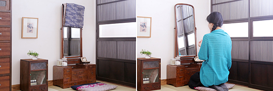 和製ドレッサー、つまり“鏡台”が馴染むのは誰もが思いつく定番です。和室に鏡台をおすすめするのは、それだけが理由ではありません。床座が中心となる和室では、人の視線はどうしても下がり気味になります。フローリングのときよりも家具の圧迫感が大きくなる和室では、鏡台のコンパクトさがピッタリです。