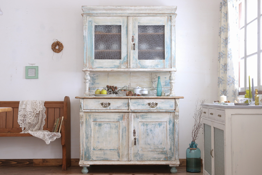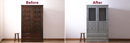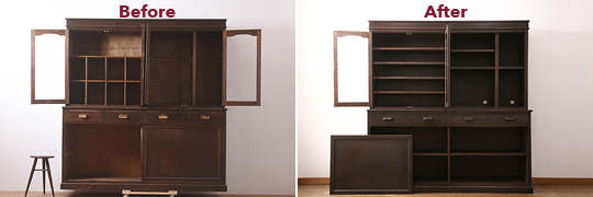 例えば、上の画像は未仕上げ品のアンティーク戸棚を高品質リペアし、木製の引き戸をガラス戸にリメイクした例。板戸で中身がしっかり隠れる作りでしたが、ガラス戸になって、ディスプレイにぴったりな収納棚に生まれ変わりました。戸棚内の棚板は、新たに製作し、また、天板はカウンターとして使えるようしっかり補強しています。