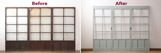 例えばこちらは、未仕上げ品の古いガラス戸を高品質リペアし、ガラスを入れ替えてリメイクしたもの。もともとは、クリアガラスとすりガラスが使われたシンプルなガラスドアでしたが、一部を色ガラスと結霜ガラスに交換して、大正ロマン風の引き戸に。最後に、全体をダークブラウンに着色して、落ち着いた雰囲気のレトロな建具に仕上がりました。