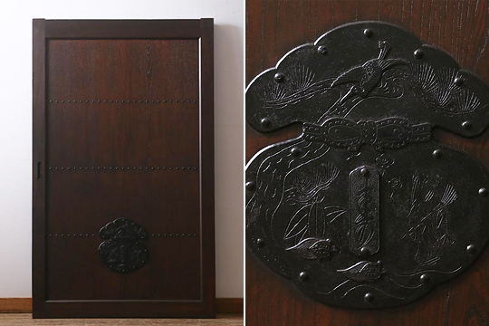 パーツは、現代物の蝶番や調整式ラッチ、鍵金具に加え、アンティーク箪笥の引き手と、当店で製作したアクリル製の家紋を取り付けています。箪笥の金具を活用したり、家紋を製作・取付したりと、細部まで丁寧にこだわった作りで、オリジナリティ溢れる上質な蔵戸に仕上がりました。