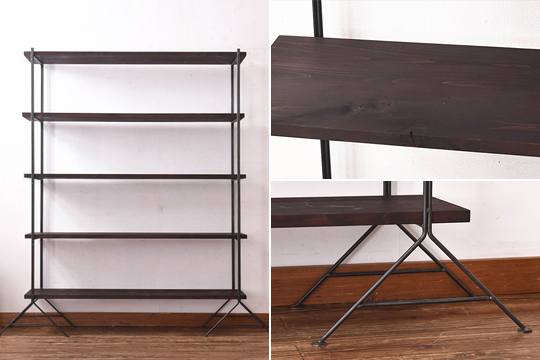 こちらは、当店のオリジナル商品である、無垢材を贅沢に使ったアイアンラック。棚板はすべて無垢材製で、アイアンフレームは存在感を抑えた細身ですっきりとしたデザインです。シンプルで無骨な味わいがあり、ヴィンテージテイストの店舗におすすめです。
