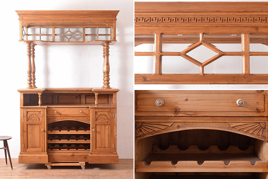 こちらは、1910年頃に作られたイギリスアンティークのキャビネット。全体をストリップド加工して、自然な木肌や彫刻の美しさを引き立たせて仕上げています。