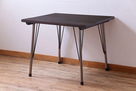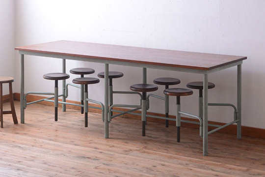 こちらは、明治期の松材製古材天板に鉄脚を取り付けたテーブルです。天板は無塗装のまま仕上げ、古材らしい素朴な味わいが感じられるよう仕上げています。ジャンクな鉄脚がかっこよく、ヴィンテージテイストの店舗にぴったりです。