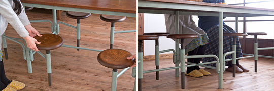 椅子やソファ、ベンチ、スツールなど、クッション張りの什器は、中身のクッションや張地をお好きなものに交換できます。クッションは、ウレタンスポンジを使って、お好みの硬さにリメイクできますよ。