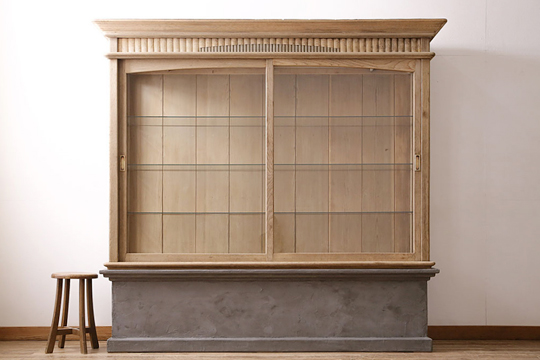 こちらも大正時代に作られたアンティークガラスケース。全体をストリップド加工して、古いナラ材の美しい木肌を引き立たせたディスプレイ什器です。木部のデコラィブな装飾が、ほどよくシンプルで洗練された印象になりました。淡い白木の色と透き通ったガラスが美しく調和しています。