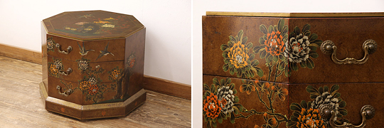 ちなみにシノワズリ様式とは、17世紀中期からヨーロッパで流行した中国風の装飾様式のこと。当時のヨーロッパ人が憧れた東洋のイメージが反映されていて、アジア風の花鳥や風景などが描かれています。西洋独自のセンスが光っていて、アジアンアンティーク家具の中でも特に煌びやかな印象です。