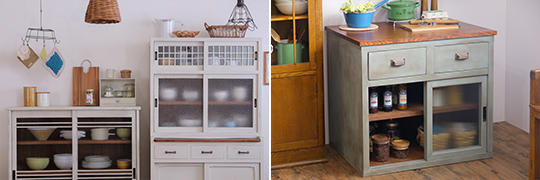 食器や調理器具、食料品などをたっぷりしまえる包容力のあるレトロな棚をお探しの方には、収納力が断トツで優れている食器棚(カップボード)がぴったりです。