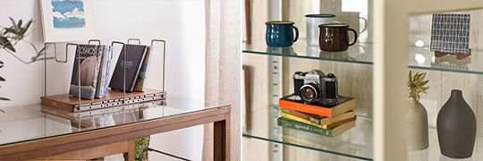 レトロなガラスケースはデザインもシンプルなので、入れるもののジャンルを選びませんし、またガラスケースの強度は見た目以上にしっかりしているので、ものを無理に詰め込んだりしない限りは多少重みのある本などもきちんとしまっておくことが可能。様々なものを入れて楽しめます。