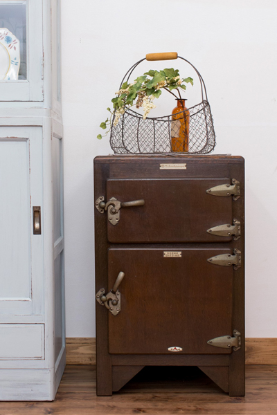 こちらは扉を開けると収納スペースが2段式になっているのですが、当時は上段に氷を入れて、その冷気で下段にある食物類を冷やしていたそうです。ごつっとした取っ手兼留め金具もとってもスタイリッシュで存在感抜群。非常に目を引くアイテムです。